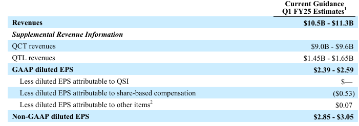 - The company forecasts a “mid-single-digit growth” in QCT Handset revenue (60% of total revenue in 4Q), despite the absence of Huawei revenue in its 1Q FY2025 guidance.