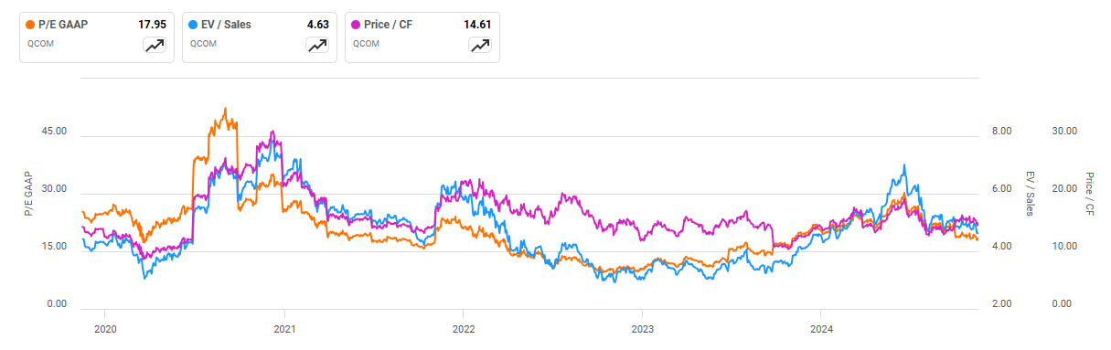 The stock is trading at an attractive valuation, following a nearly 30% pullback from its June 2024 high. According to Seeking Alpha, QCOM’s valuation multiples are now below their 5-year averages. The previous decline in valuation can be attributed to a 33% YoY drop in non-GAAP EPS in FY2023, following its peak in FY2022. However, the company reached an inflection point in 1Q FY2024, with earnings starting to rebound, showing a 21% YoY growth for FY2024. Despite this recovery, its P/E and EV/sales TTM multiples remain below their FY2022 highs.
