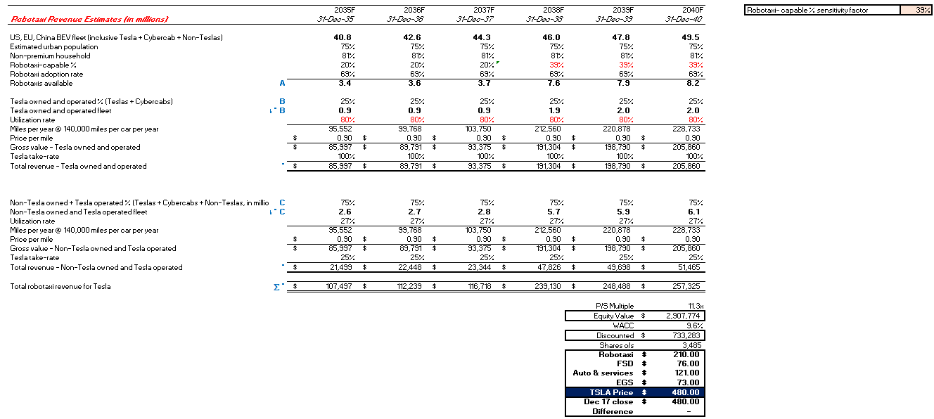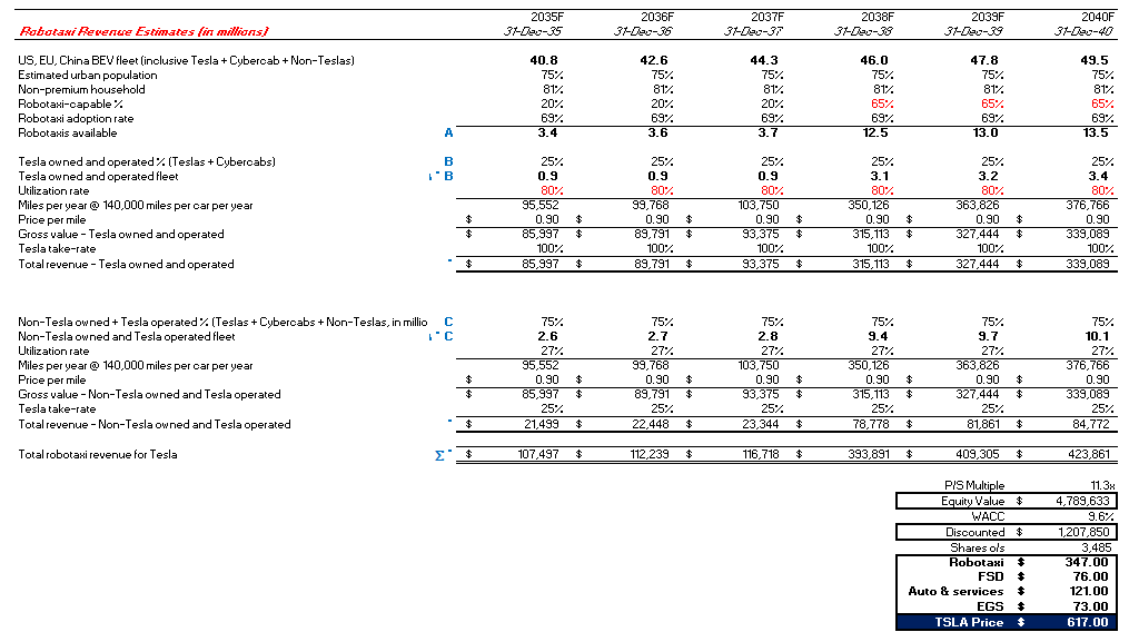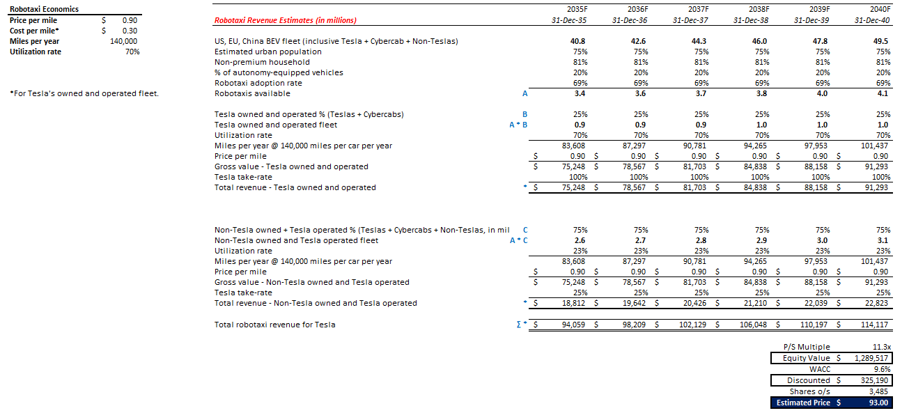 Under these assumptions, Tesla’s Robotaxi platform is expected to grow into a $100+ billion business by 2040. By applying an 11.3x multiple to total projected 2040 robotaxi revenues, discounted at a WACC of 9.6%, the business yields an estimated intrinsic value of $325 billion, or $93 per share.