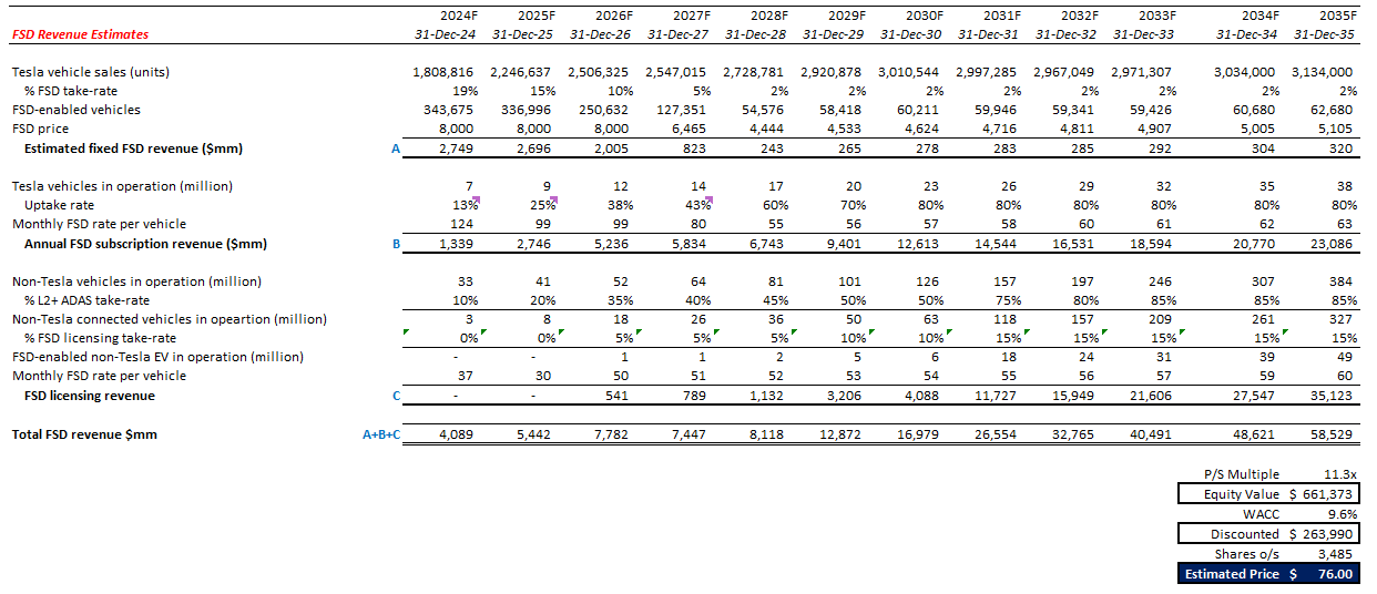 By applying an 11.3x multiple on projected 2035 FSD revenues, discounted back at a WACC of 9.6%, the business yields an estimated intrinsic value of about $264 billion. The valuation assumptions applied are consistent with the average multiple observed across comparable high-growth, high margin software names, and considers Tesla’s capital structure and risk profile. This would put the business at about $76 per share based on Tesla’s outstanding diluted share count of about 3.5 million.