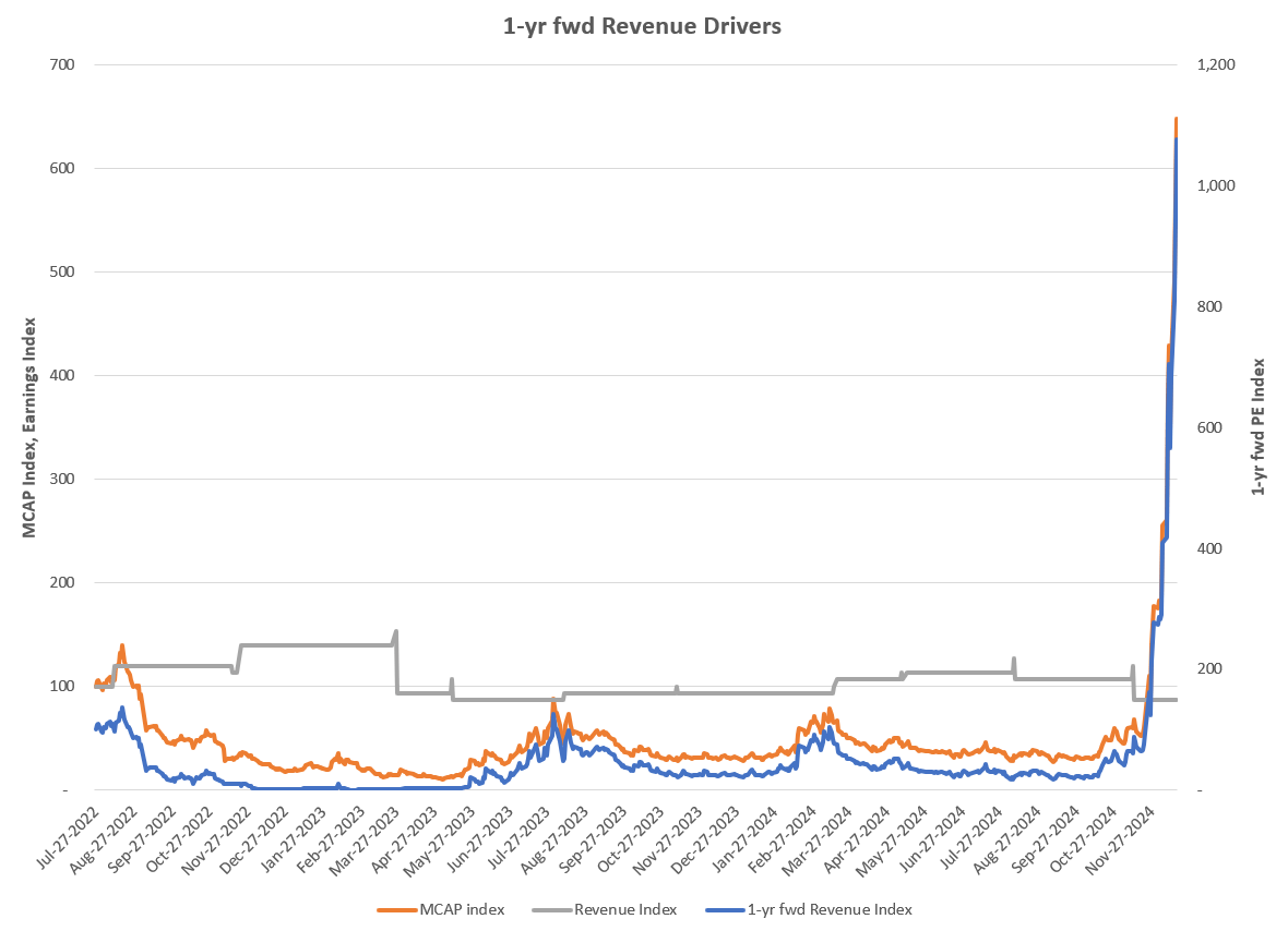 There is a clear sign that the recent, sharp appreciation in the stock is purely due to a hype since all of the increase in the price (orange line in chart below) is explained via a re-rating of the valuation multiple (blue line in chart below) at stable to falling forward revenue estimates (grey line):