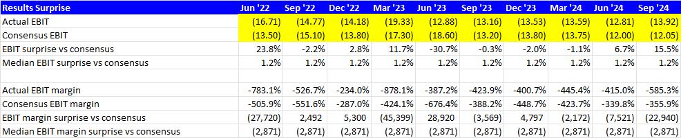 And has posted larger EBIT losses than what sell-side analysts had pegged in, particularly over the last couple of quarters:
