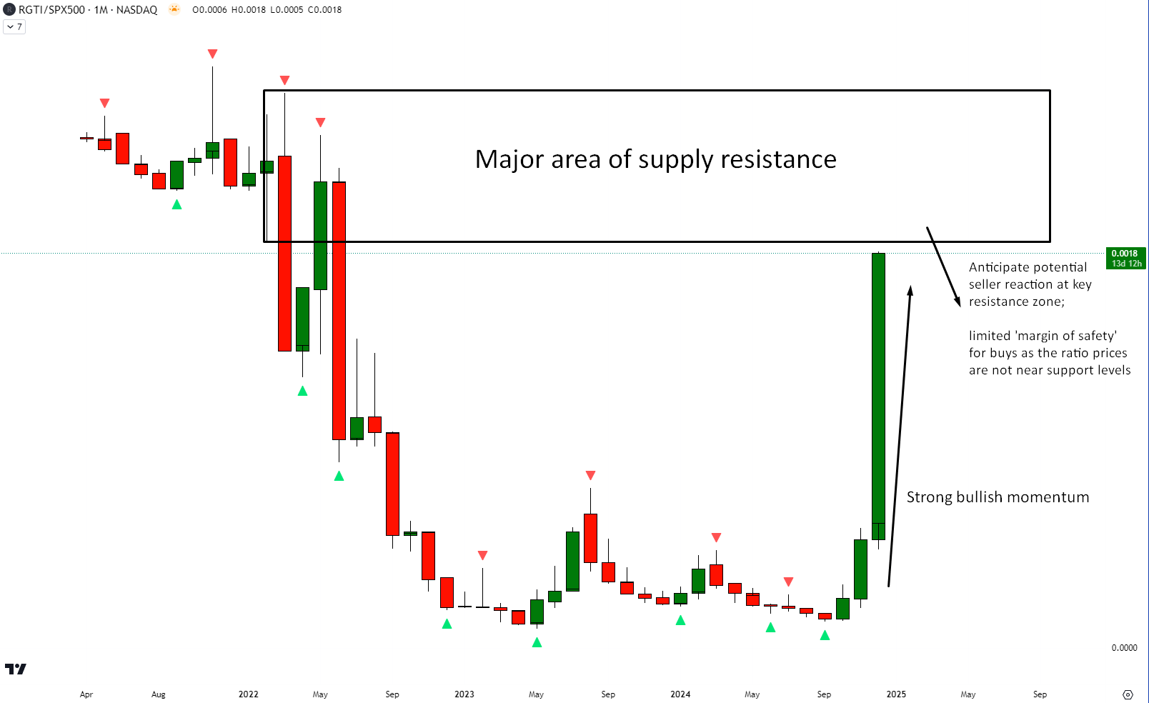 Relative to the S&P500 (SPY) (SPX) (IVV) (VOO), RGTI is in a powerful bullish trend. However, it is nearing a major area of supply resistance ahead, leading to a low ‘margin of safety’ for buys even on purely technical, momentum-chasing terms.