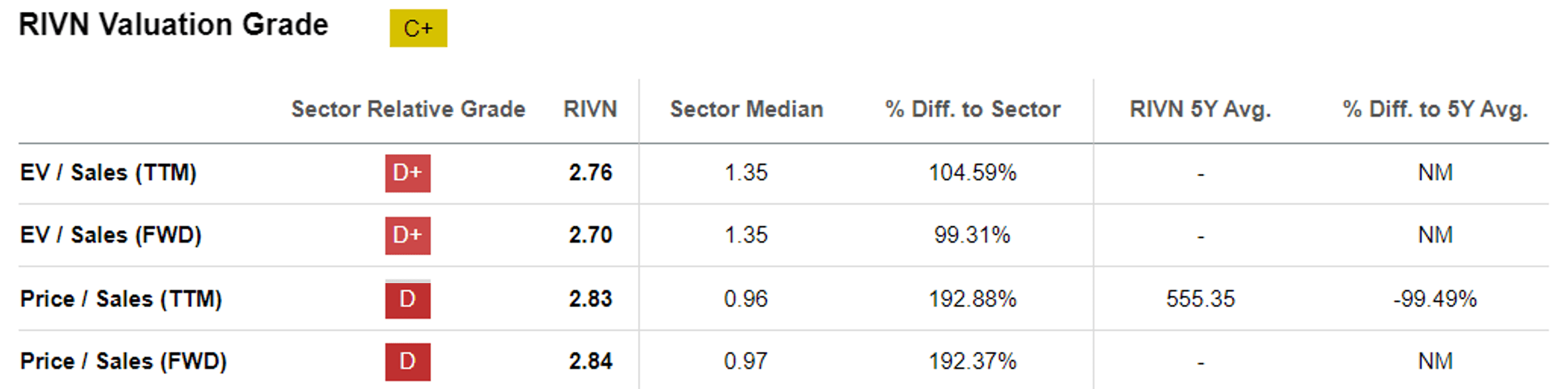 When compared to its direct EV peers, including Tesla (TSLA) at 12.32x and Lucid (LCID) at 9.02x, it is undeniable that RIVN looks somewhat attractive here, albeit elevated compared to other legacy automakers, including Ford (F) at 0.99x, General Motors (GM) at 0.91x, and Stellantis (STLA) at 0.20x.
