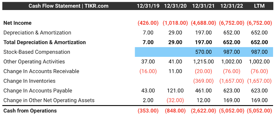 • The company’s stock-based compensation is high, skews cash flows, and not justifiable for a company that is losing massive amounts of money.
