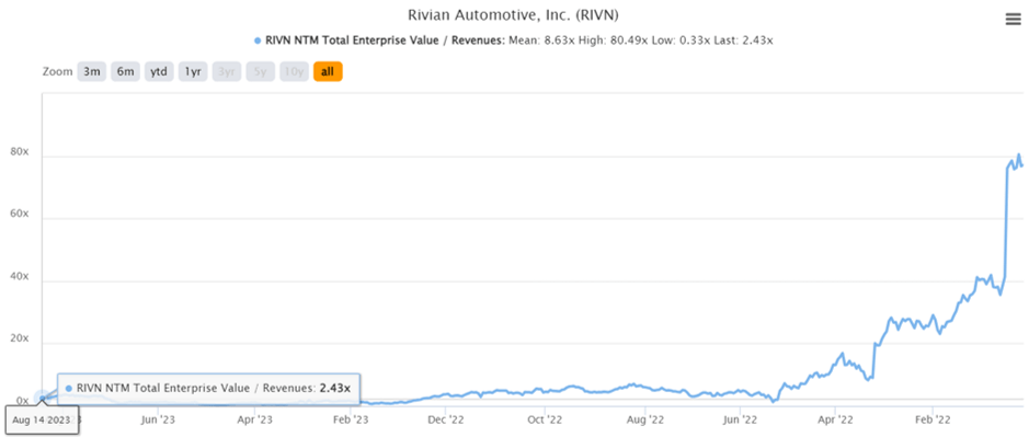 Due to its high growth cadence, it is unsurprising that RIVN’s valuation remains decent at NTM EV/Revenues of 2.43x, after the much needed moderation from the hyper-pandemic mean of 22x.