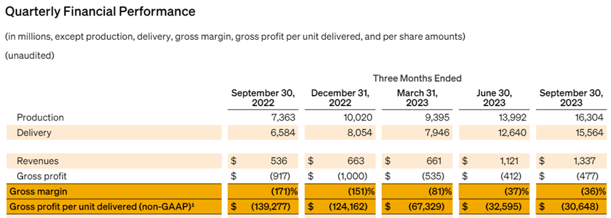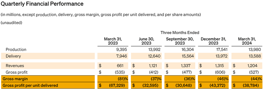 Rivian’s stock saw a bit of a jump post Q1 2024 as the company guided for “modest gross profit” by the end of the year. The company saw revenues of $1.2 billion for the quarter representing the delivery of 13,588 vehicles. As a relatively new car company in the electric vehicle space, it is not surprising to see that Rivian is still losing money on every car sold. The company generated negative Gross Profit for the quarter of -$527 million for a loss of $38,784 for every car sold. This is half of the $67,329 loss per unit at the same time last year and is in between the results of $30,648 and $43,372 in the previous two quarters.