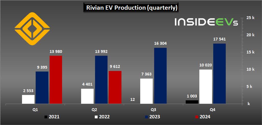 In the second-quarter, Rivian produced 9,612 vehicles at its manufacturing facility in Illinois, compared to 13,980 in the quarter-earlier period. This means that the company achieved 41% of its full-year production target and needs to produce another 33,408 electric vehicles in the second half of the year. Rivian set a production target of 57,000 electric vehicles earlier this year, which management confirmed on the Q2 earnings call. The production guidance seems reasonable to me and I would not be surprised to see Rivian exceed its full-year manufacturing target considering that deliveries are ramping up: Rivian delivered 13,790 electric vehicles in Q2’24, showing 9% year-over-year growth.
