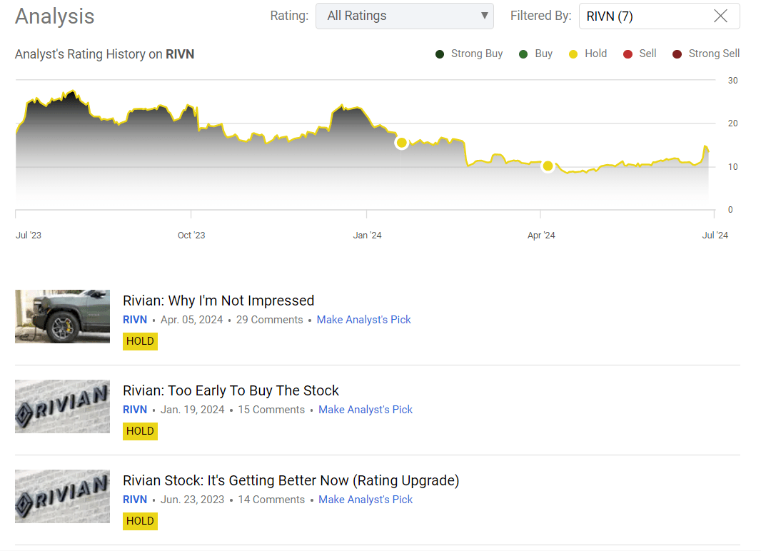 The first time I wrote about Rivian Automotive, Inc. (NASDAQ:RIVN) stock here on Seeking Alpha was in November 2021 – that was an IPO analysis where I concluded that the stock had been overvalued to a great extent at the very beginning of its public journey. It immediately surged after the IPO, and it moved away from logically explainable levels of growth – during that rise, I updated my “Sell” recommendation a few times. The stock started to crater, and I held my “Sell” rating until June 2023 when I upgraded RIVN to “Hold”, thinking that the company’s situation was improving then: Margins were showing clear signs of growth at the time; nevertheless, I couldn’t assign a “Buy” rating due to its high valuation and strong competition risk.