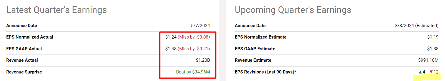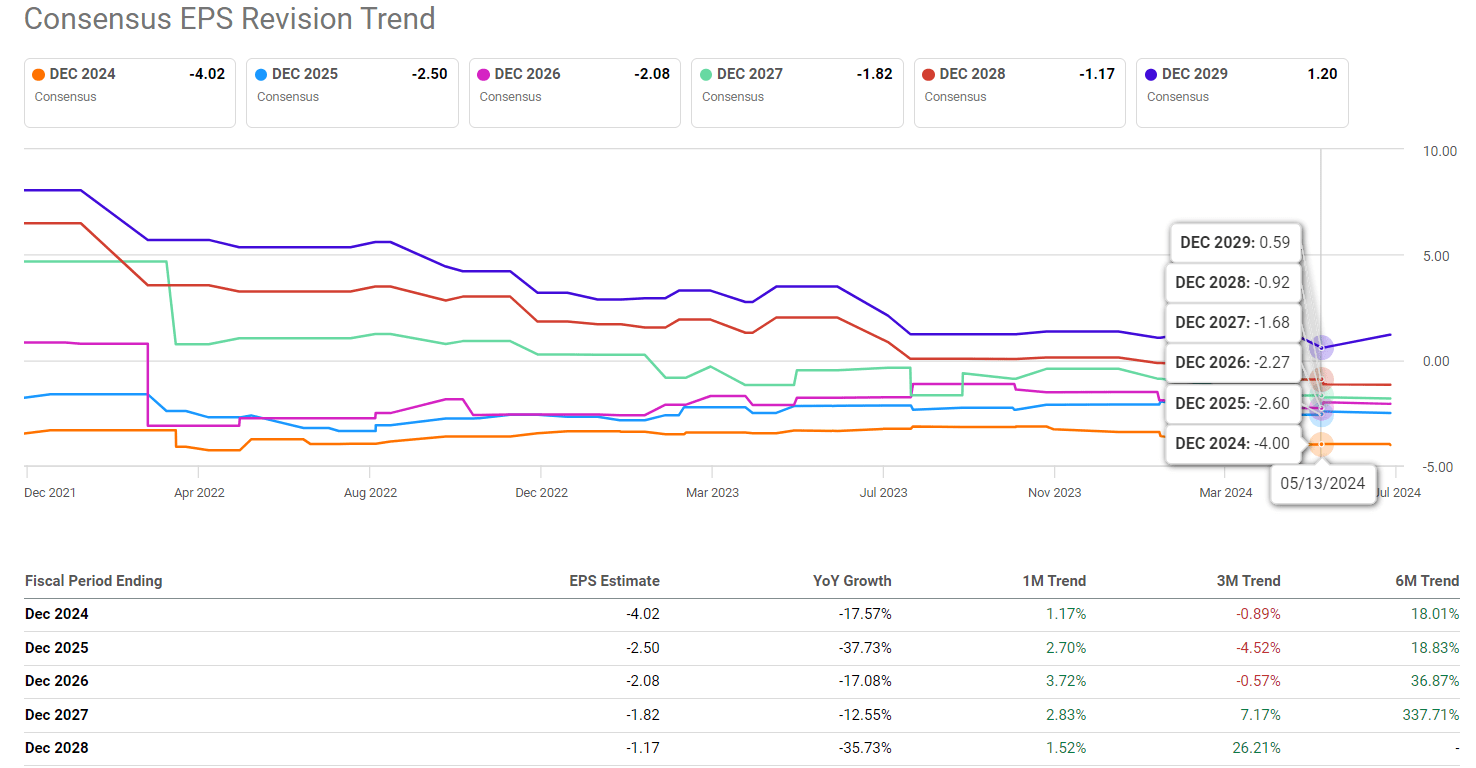 As we know from the press release commentary, a few thousand vehicles that Rivian built during Q1 FY2024 were not counted towards production since they were awaiting parts, impacting Q1 inventory and delaying their inclusion in delivery counts. So the revenue suffered, declining by 2% YoY, but beating the consensus expectation by almost $35 million. Unfortunately, we can’t say the same thing about EPS, which amounted to negative $1.24 per diluted share on an adjusted basis – that was $0.08 less than expected. The drop in the bottom line occurred amid an adjusted EBITDA loss of $798 million – while the EBITDA margin improved by 400 basis points to 8.0%, the firm faced elevated cash usage due to increased accounts receivable and inventory balances. The negative surprise in terms of EPS expectations has prompted Wall Street analysts to lower their estimates for the next few quarters, delaying the prospect of Rivian finally breaking even on the bottom line.