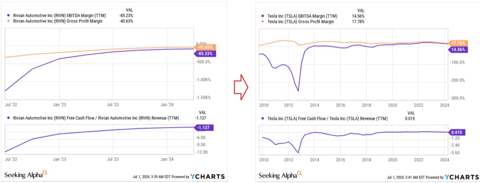 Speaking about guidance, Rivian’s management reduced the FY2024 CAPEX forecast by $550 million to just $1.2 billion, with further reductions expected in FY2025. The long-term targets still speak of a 25% gross margin, high-teens adjusted EBITDA margin, and a 10% FCF margin. These numbers are similar to what we saw at the peak of Tesla (TSLA), which means they could be feasible if the company’s product remains competitive over time.