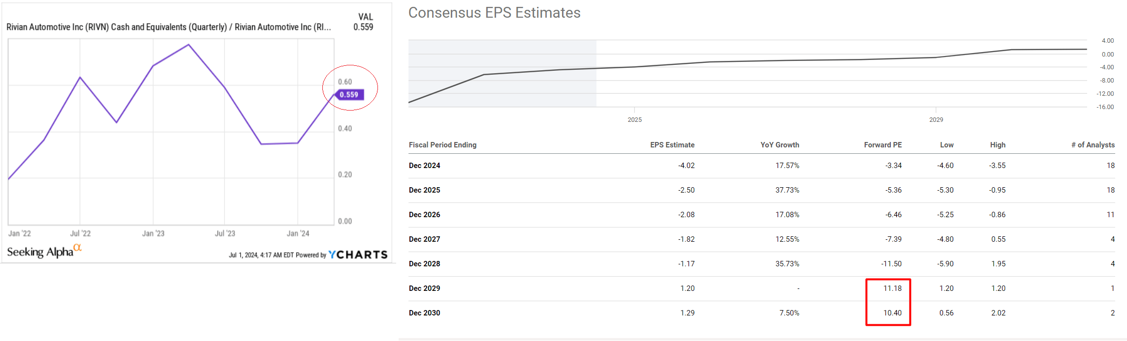 It’s challenging for me to say that the company is undervalued. The first positive EPS is expected to emerge only in FY2029, but considering my forecast that EPS estimates will likely increase, Wall Street may soon start anticipating a break-even point around FY2027 instead of FY2029. This scenario would significantly reduce uncertainty, which is a positive sign for the stock. Additionally, the company is currently trading at ~56% of its cash balance to market cap – as Rivian’s liquidity improves with the new deal with Volkswagen, this ratio should increase, providing a fresh incentive for stock growth, in my view.