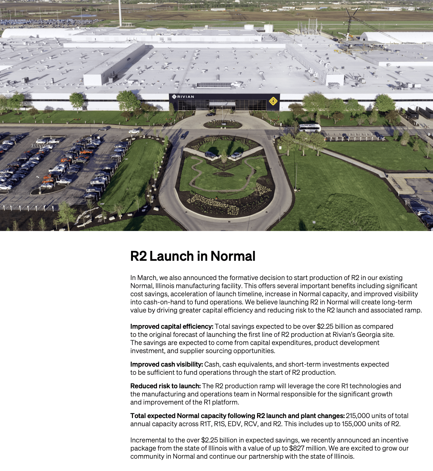 The first: R2 production is now expected to be at the company’s Normal, IL factory site, instead of shifting production to Georgia. This move is expected to deliver $2.25 billion in traditional capex savings. As a reminder, in the second half of this year, Rivian is expected to temporarily shut down this factory to incorporate additional material cost savings on the R1 line that is expected to help Rivian achieve positive gross profit in Q4 (something that has eluded Rivian thus far).