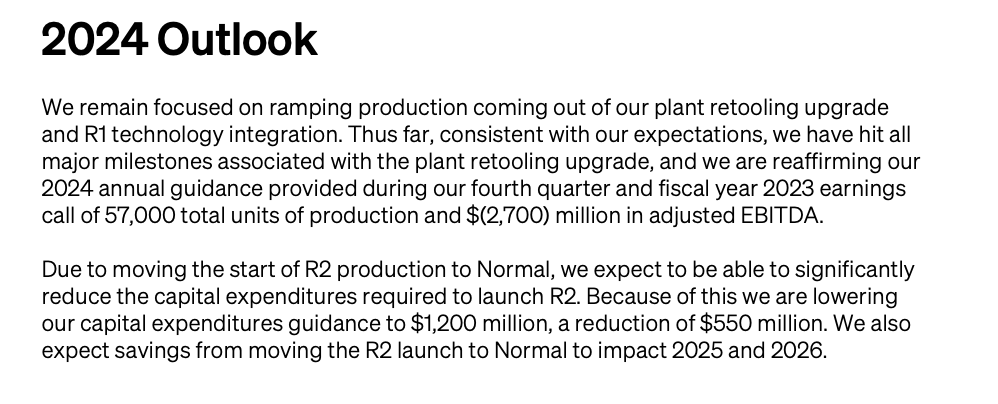 Rivian outlook: capex savings (Rivian Q1 shareholder letter)