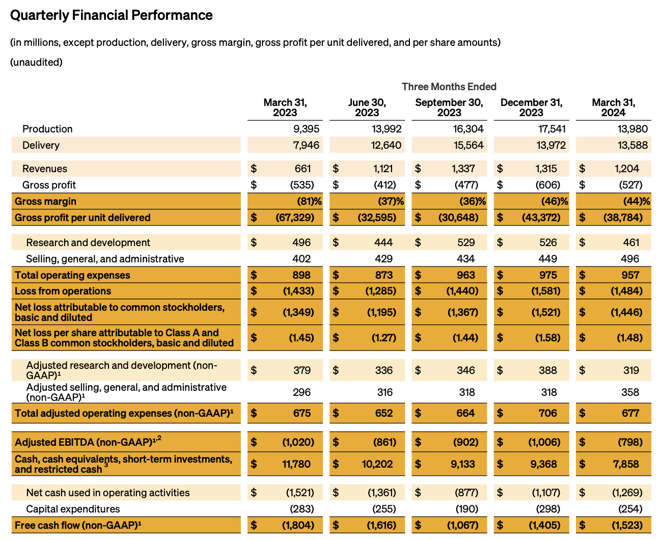 Q1 deliveries of 13.6k units grew 71% y/y, while revenue of $1.20 billion grew 82% y/y and quashed Wall Street’s expectations of $1.17 billion (+77% y/y). Of course, comps will start to get tougher for Rivian in the second half of FY24, as the company comps against strong growth in the September quarter while simultaneously expecting ~flat production and deliveries this year, amid the Normal factory shutdown. Still, it’s worth noting that in Q1, Tesla revenue declined -9% y/y. There can be no doubt that Rivian is gaining share.