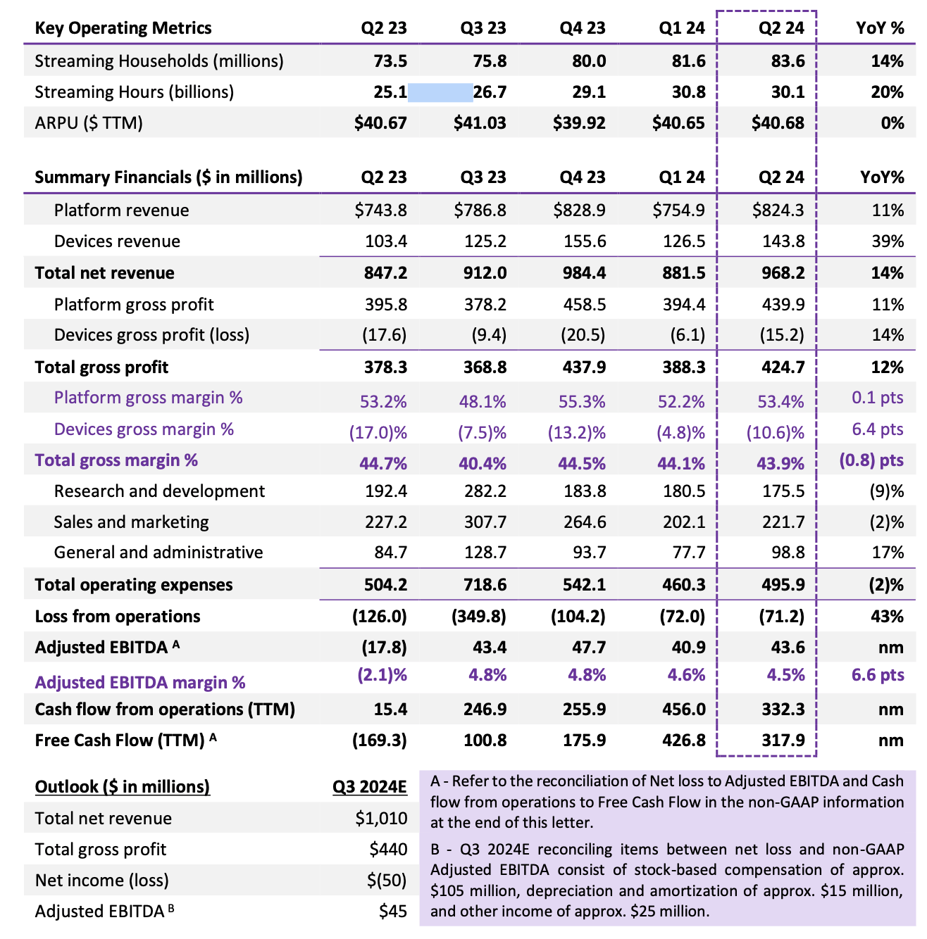 Let’s now go through Roku’s latest quarterly results in greater detail. The Q2 earnings summary is shown below: