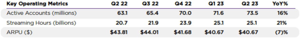 In Q2, ARPU was 40.67 on a trailing 12-month basis, down 7% year-over-year. This decline was due to strong global active account growth outpacing platform revenue growth. We expect that over time, monetization per account will continue to grow as the advertising industry rebounds and as a larger percentage of our U.S. customers cut the cord.