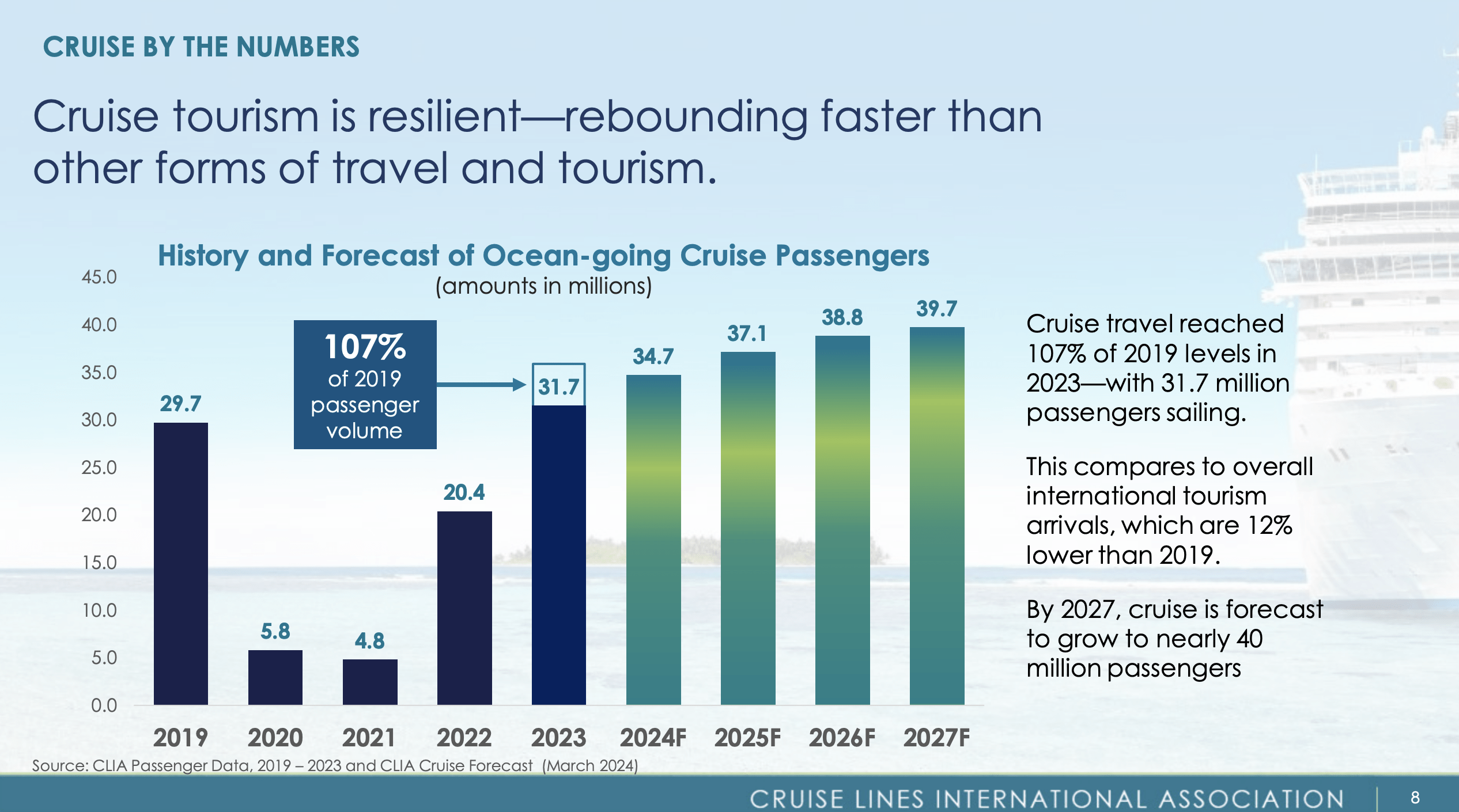 • The cruise line continues to ride industry growth, with passengers growing at a nearly 10% clip in 2024, far above 2019 levels.