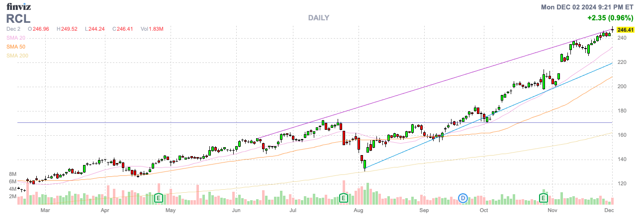 • Royal Caribbean has rebounded from bankruptcy fears during Covid to record profits, with stock prices soaring to all-time highs, now over $100 above pre-Covid levels.