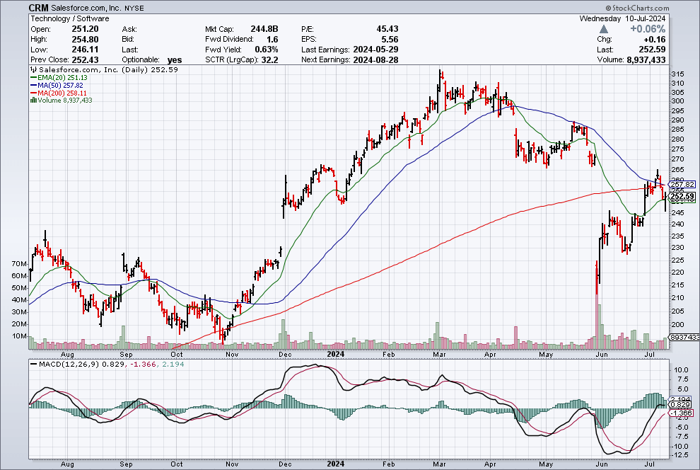 In May, Salesforce’s price plummeted from around $270 to $215 in a single day before rebounding to $252 (at the time of writing). In the process, Salesforce broke through the 200-day moving average, a long-term bullish trend line.