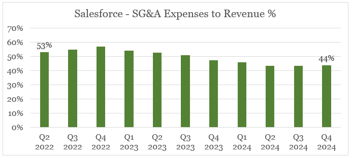 The key development behind this success has been the reduction of the company’s sales, general & administrative expenses relative to sales. In other words, CRM’s management has been laser focused on improving efficiency at the business and thus capitalizing on the potential for economies of scale.