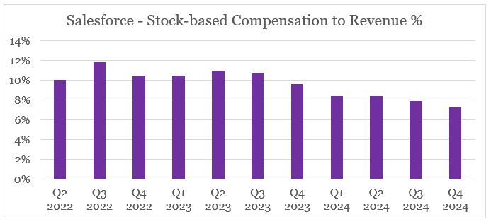Another shift in Salesforce’s strategy, has been the less reliance on large M&A deals and a stronger focus on internal growth and the development of value-added services, such as the conversational AI assistant – Einstein Copilot. At the same time, the stock-based compensation expense has also been reduced as a share of revenue and, in combination with the recent share repurchase program, has reduced shareholder dilution.
