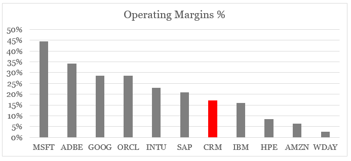 There is, however, long way to go before Salesforce would be placed among the most profitable enterprises in the cloud sector on a GAAP operating margin basis (see below). But the opportunity for more realized economies of scale in combination with its exceptionally high gross margin would make that possible in the coming years.