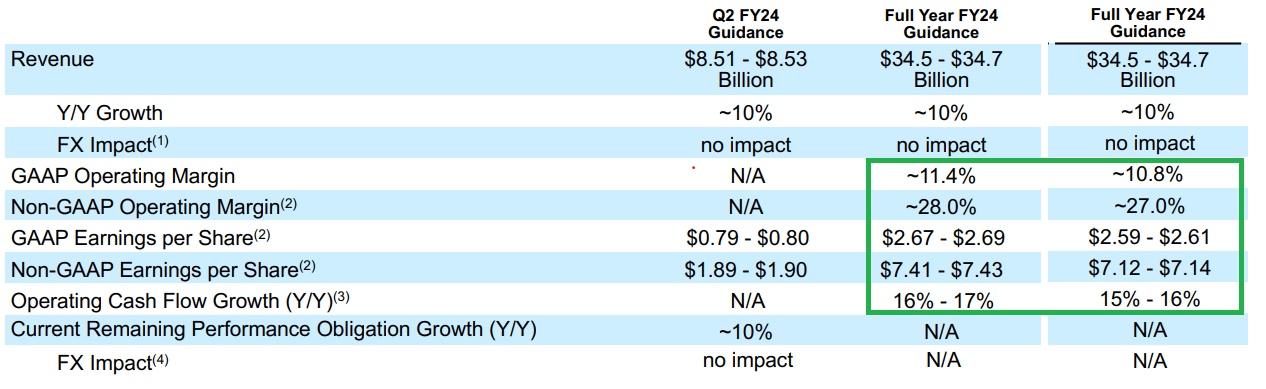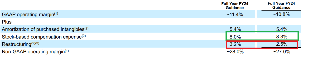 The issue with large acquisitions is largely a done deal, since there isn’t much that could be done at this time, but the adjustments for stock-based compensation and restructuring for FY 2024 have both changed during the past three months.