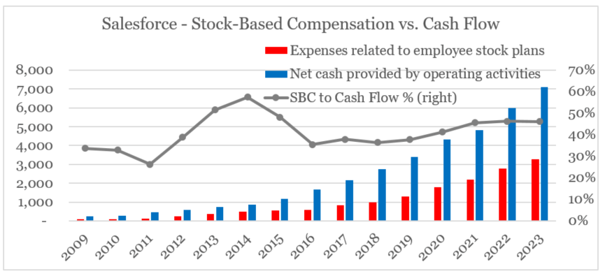 For example, stock-based compensation expense for FY 2024 is expected to drop from $2.88 per share to $2.80 from the prior quarter. The issue of Salesforce’s enormous share-based compensation packages relative to its cash flow has been one of the major red flags that I pointed out all the way back in 2020.