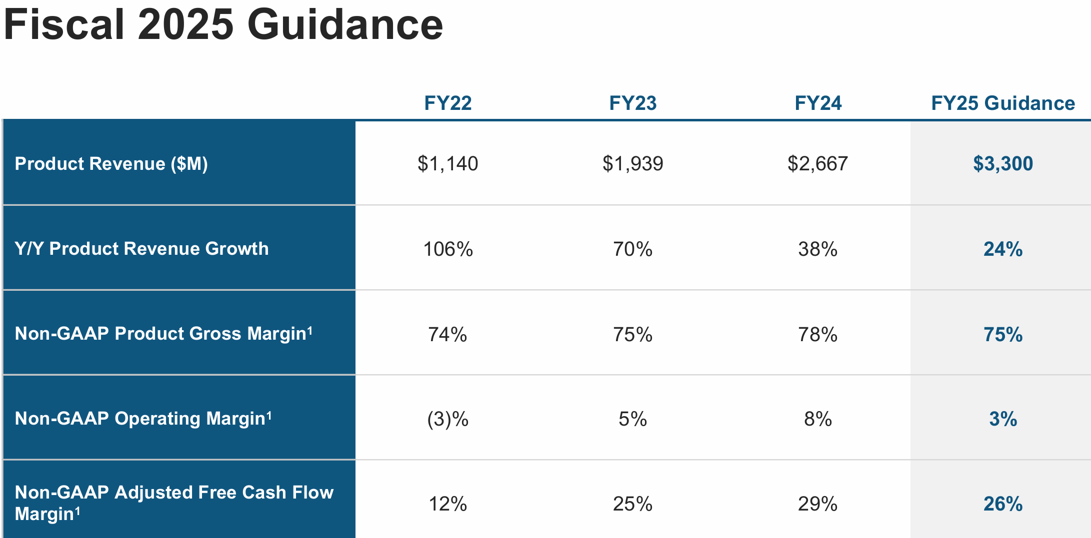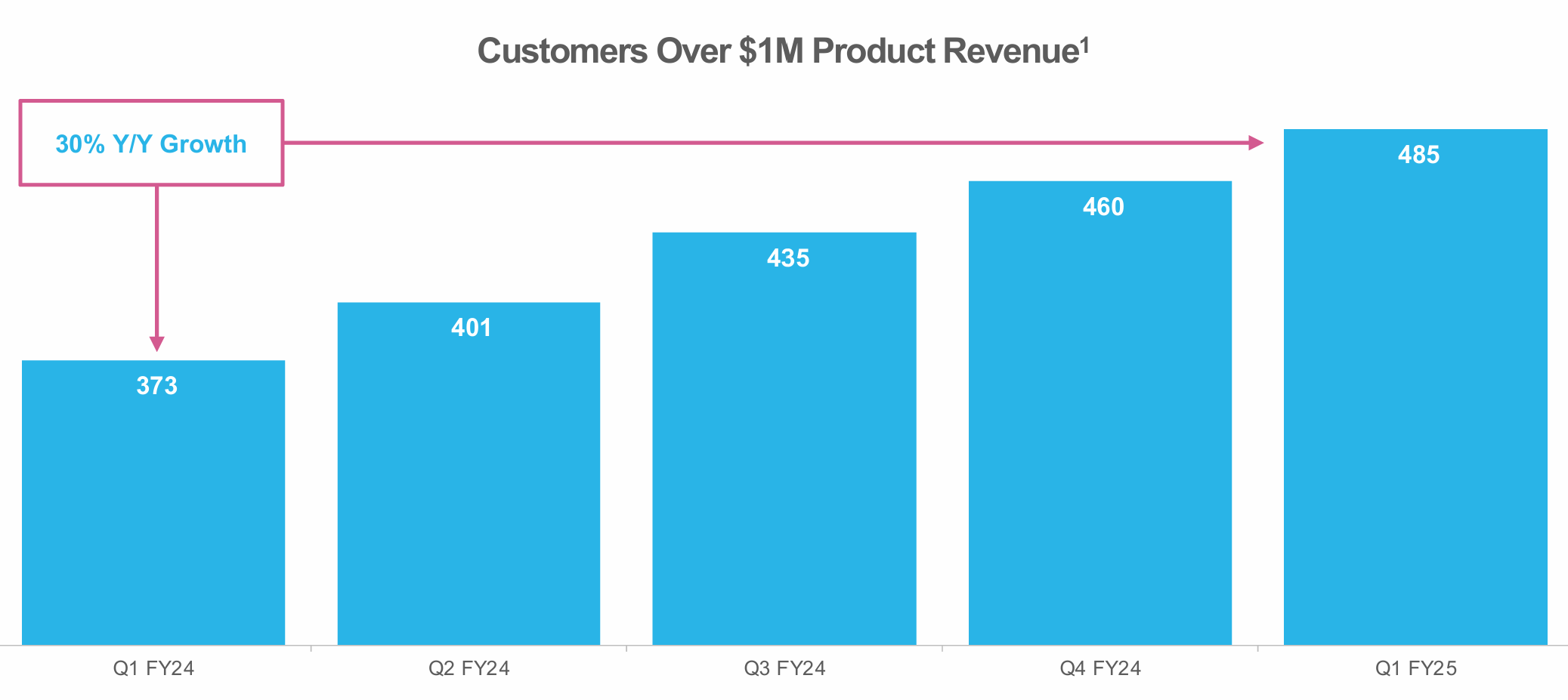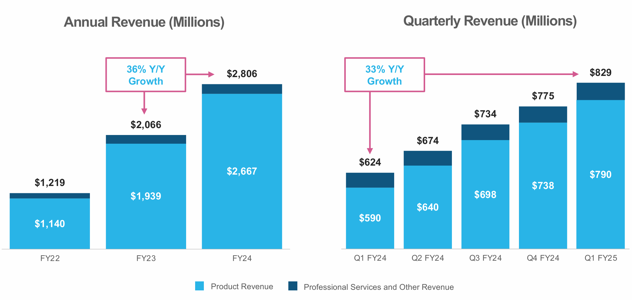FY1Q25 product revenue came in at $790 million, growing 34% from the prior year.