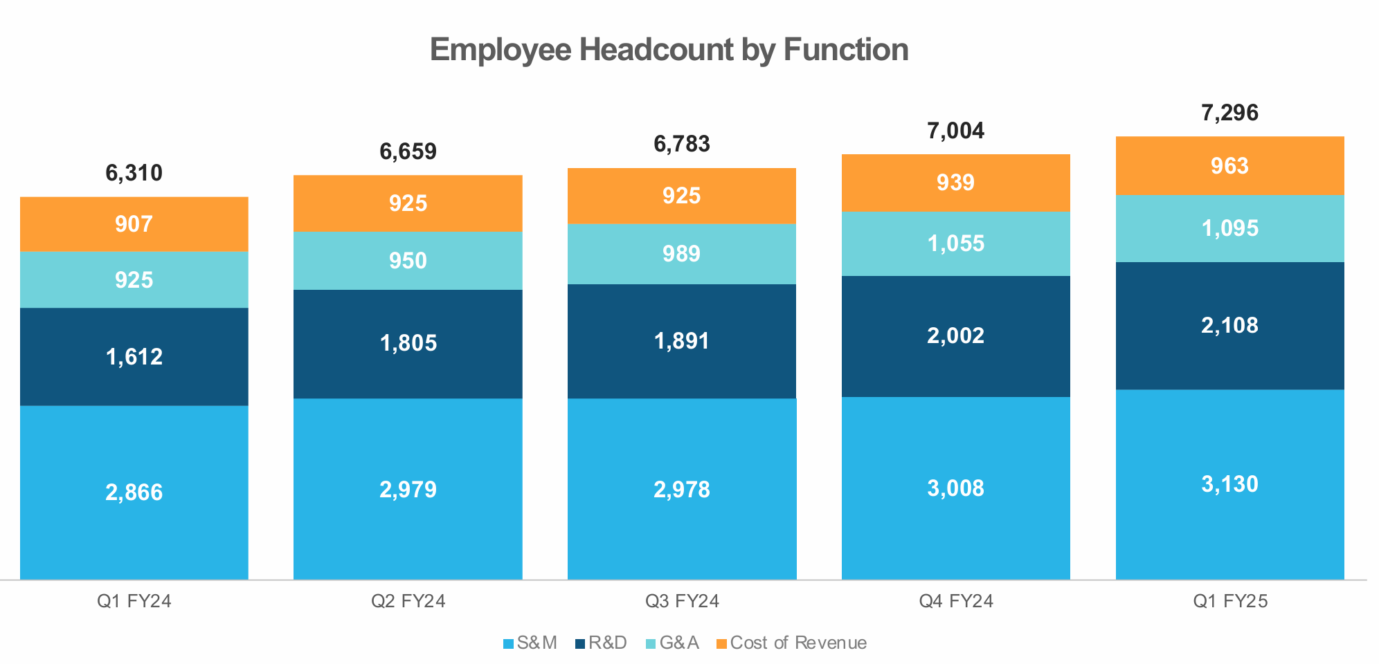 Snowflake has been hiring aggressively, with headcount growing 16% from the prior year, with the R&D team growing 31% from the prior year and the sales and marketing team growing just 9%.