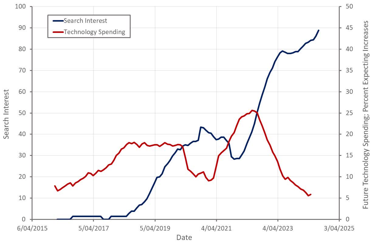 Figure 2: “Snowflake Pricing” Search Interest and Future Technology Spending Expectations (source: Created by author using data from Google Trends and The Federal Reserve)
