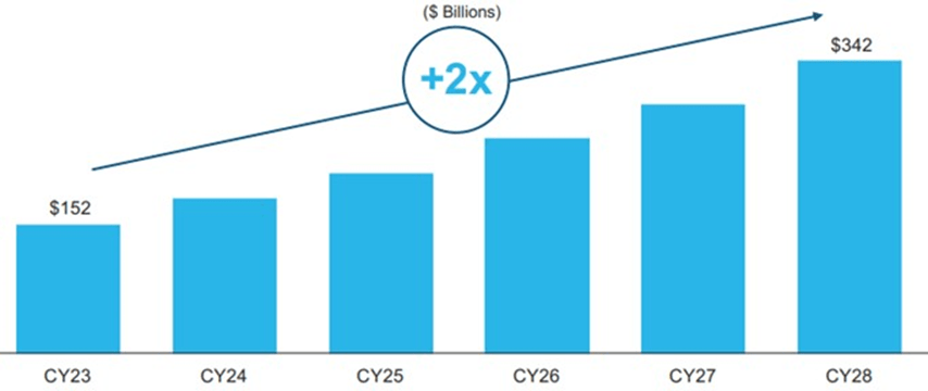 Expectations for cloud spending growth are now being driven by generative AI hype, with public cloud services spend expected to increase from 400 billion USD in 2023 to 2,300 billion USD in 2033. While this could be expected to create a large tailwind for a company like Snowflake, there is considerable uncertainty around how much of this spend will eventuate and where it will be directed.