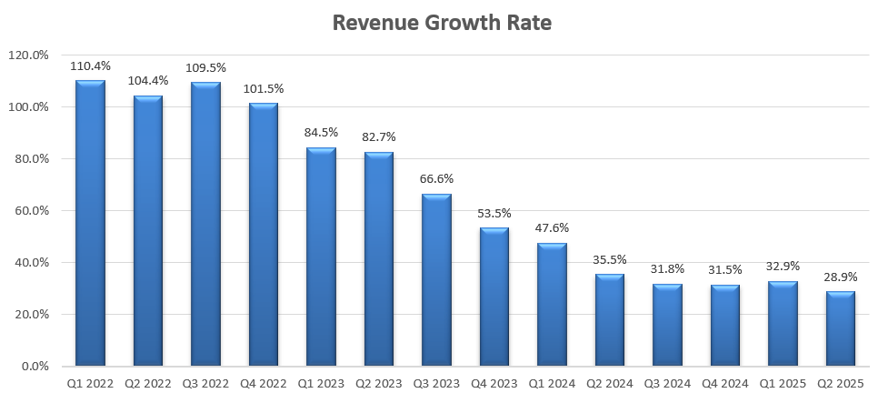 As indicated over the call, Snowflake delivered a strong growth in bookings, with 48% year-over-year growth in Remaining performance obligations (RPO). Meantime, the company reported 28.9% growth in revenue in Q2, as depicted in the chart below.