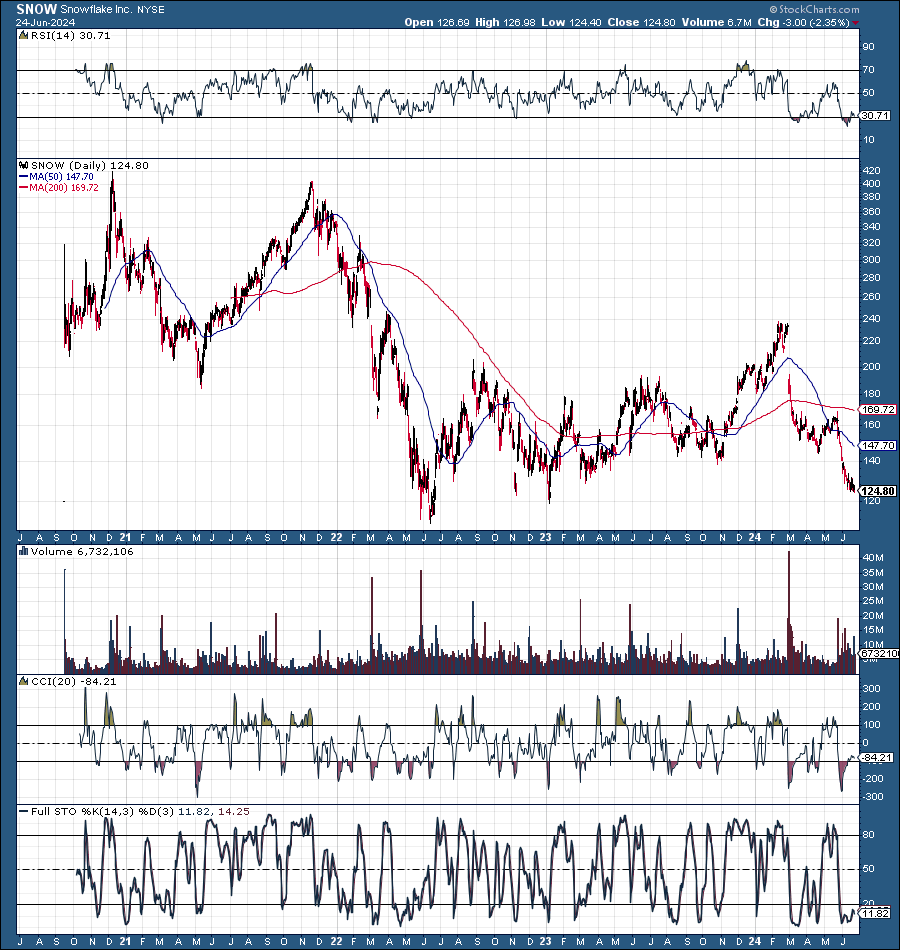 While we’ve seen some attempts at recovery, Snow remains around a low point, at roughly $125. Also, we’ve seen the RSI below 30 and the CCI around -300, demonstrating exceptionally oversold technical conditions. Moreover, the full stochastic and other technical gauges appear to be reversing, and Snow’s technical momentum could improve soon.