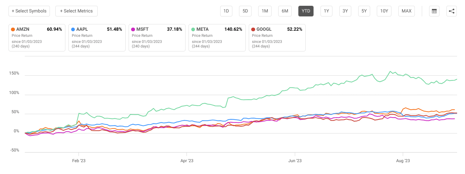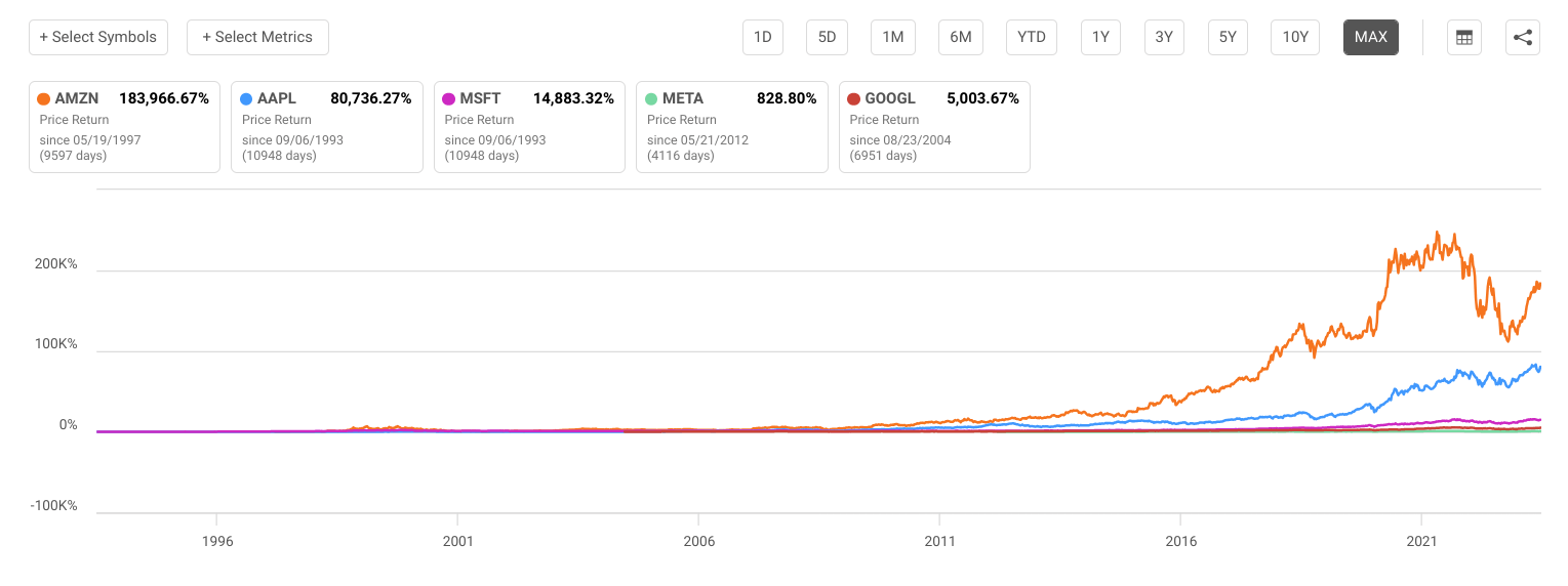 As you can see, aside from Meta, the stock has performed the best of the Tech Titans on a YTD basis. However, I always think there’s much to learn from looking at any stock and its significant peers over several different periods. Amazon has ebbed and flowed over the years, but one of the significant lessons of the prolific rise of Technology in the US stock market and worldwide has been to be a long-term owner of Amazon.