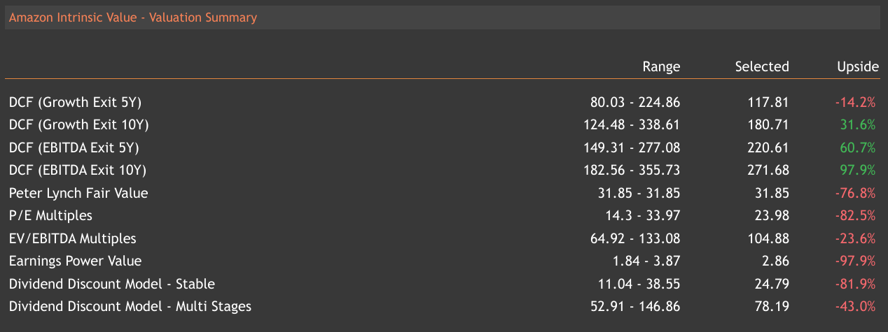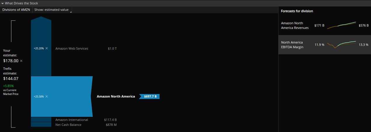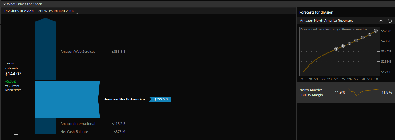 For example, in the Trefis model above, AWS constitutes 55% of the price estimate, while the prodigious Amazon North America only constitutes 37% of it despite most revenue coming from it. This means that relatively small forecasting errors in the AWS segment can lead to considerable differences in potential earnings power. As you can see, when I modify the forecast to be about 10% higher at the end of the period, it has a measurable effect on the implied intrinsic value of Amazon.