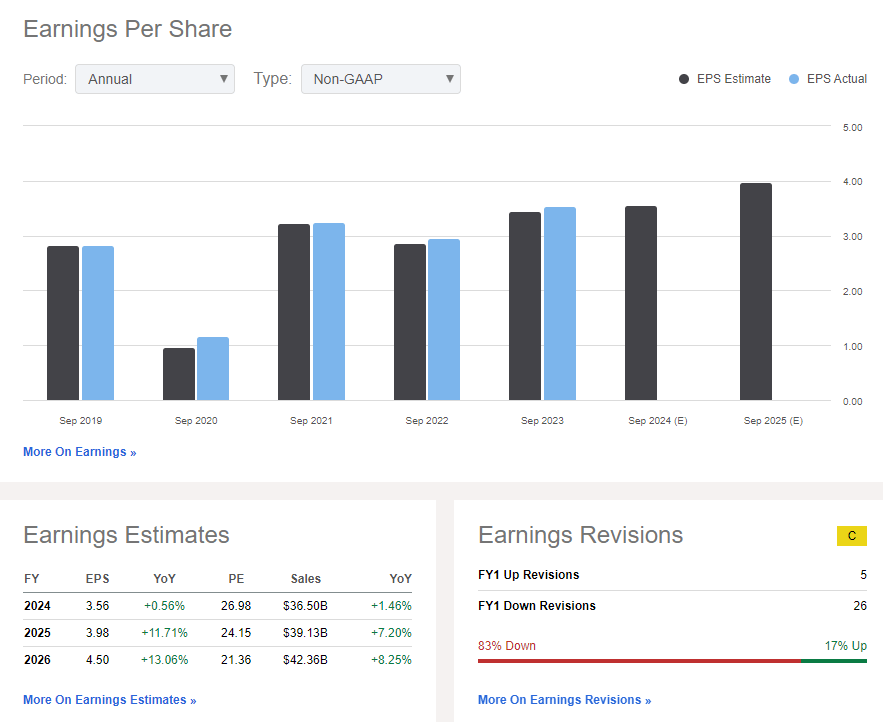 On the earnings outlook, there is some reason for hope. Operating EPS is projected to rise about 1% in 2024 with out-year per-share earnings growth in the low double digits. An even higher EPS boost is then expected in FY 2026. But following the soft Q2 and even after the new CEO announcement, there has been a slew of downward EPS revisions by Wall Street analysts. But Starbucks’ free cash flow per share is decent at $3.37, resulting in a 3.5% FCF yield.