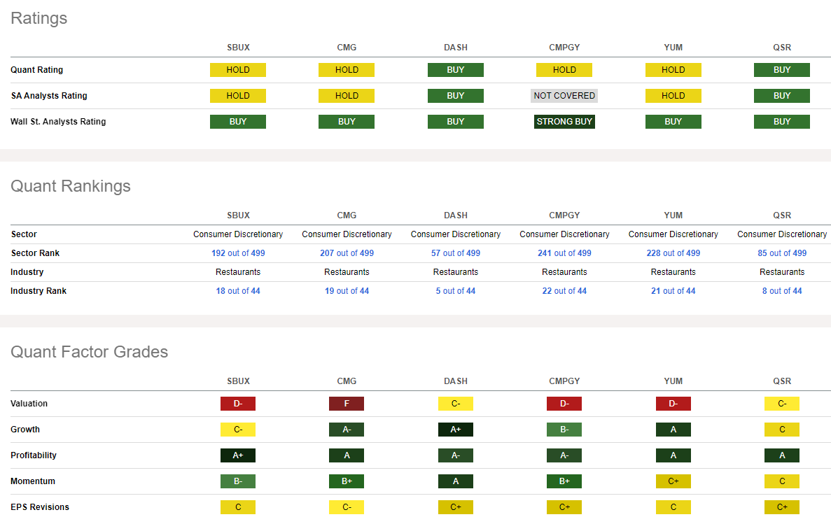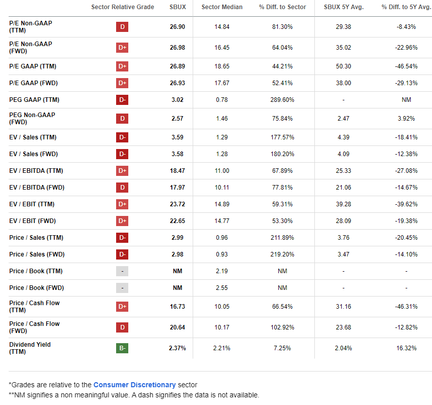 Compared to its peers, SBUX features a weak valuation rating, but I will again note that many of its valuation multiples are cheap on a relative basis. Moreover, growth is seen picking up in the quarters to come, and long-term profitability trends could turn more favorable if Niccol’s expertise is effectively monetized for shareholders.