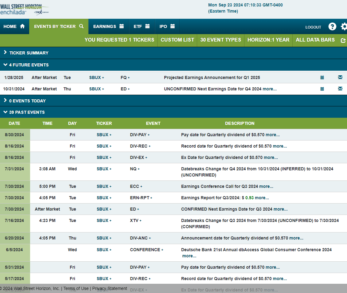 Looking ahead, corporate event data provided by Wall Street Horizon show an unconfirmed Q4 2024 earnings date of Thursday, October 31 AMC. No other volatility catalysts are seen on the calendar.
