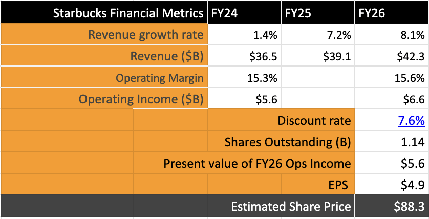 At the same time, I expect a 30-point margin expansion in Starbucks operating margins, implying an ~8.2% compounded growth rate in operating income through FY26. With Niccol now at the helm, there is scope for operating margins to further expand once the digital strategy gets underway, but these kinds of turnarounds will take at least 1-2 quarters.