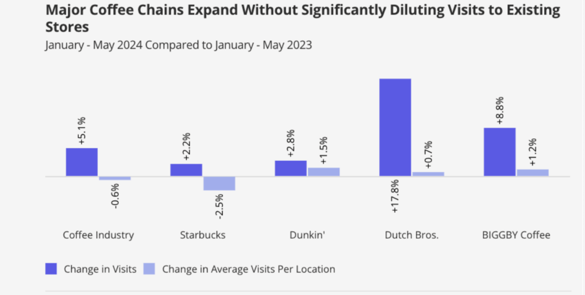 Starbucks was the only coffee chain to reportedly see a decline in average visits per store location in H1 of 2024 versus H1 of 2023.