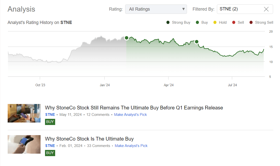 Nevertheless, in my opinion, the stock has not yet reacted as it should. I attribute this mainly to the fact that STNE is far from being one of the most talked about stocks among Wall Street analysts, as evidenced by the modest number of sell-side reports following the Q2 release. According to TrendSpider (proprietary source, August 2024), there was only one “Hold” rated report from John Coffey 15 days ago.