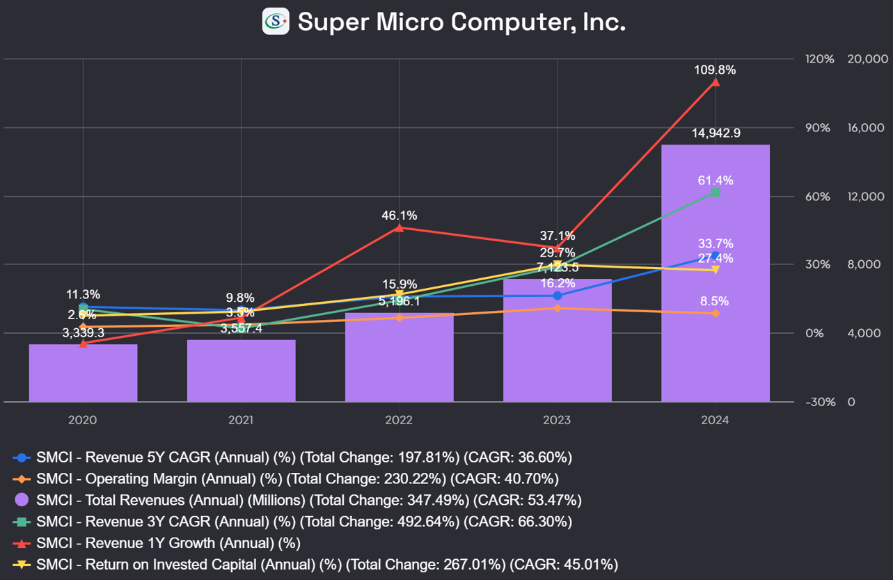 Important, Super Micro was delisted from NASDAQ on the 24th of August 2018 primarily due to its failure to comply with the exchange’s listing rules, specifically Rule 5250(c)(1), which requires timely filing of financial reports with the SEC. NASDAQ relisted Super Micro on the 14th of January 2020. Since the 24th of August 2018 to today, the company returned ~23X to the investors, and if we consider the company peak in March 2024, the stock would have returned ~68X.