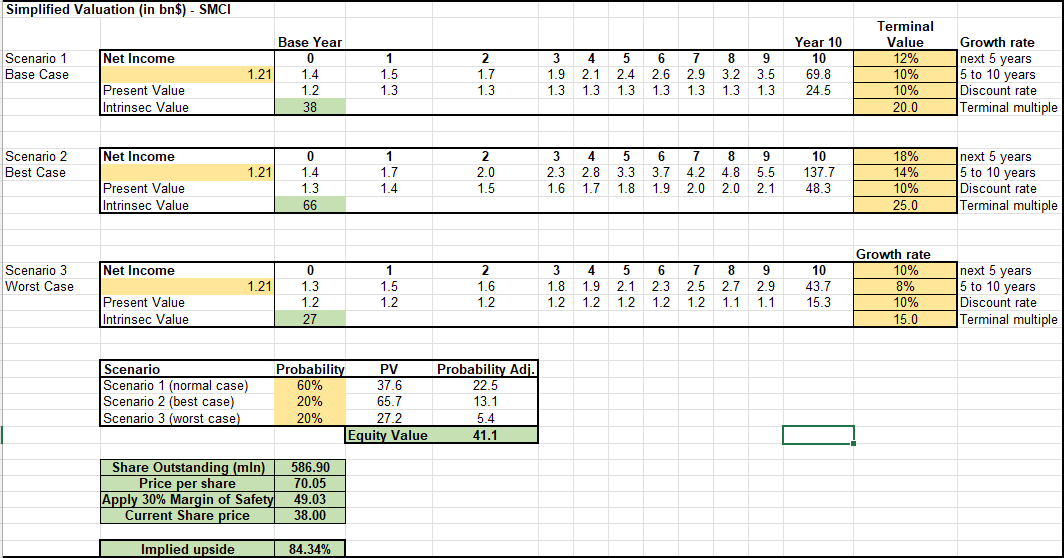 Usually, I use FCF to evaluate the intrinsic value of a company, but in Super Micro case, I use Net Income because FCF is not reflecting the actual business performance as the company has been experiencing very high growth rates, over 100% year-over-year. This rapid growth has necessitated significant investments in inventory and accounts receivable, which has negatively impacted cash flow.