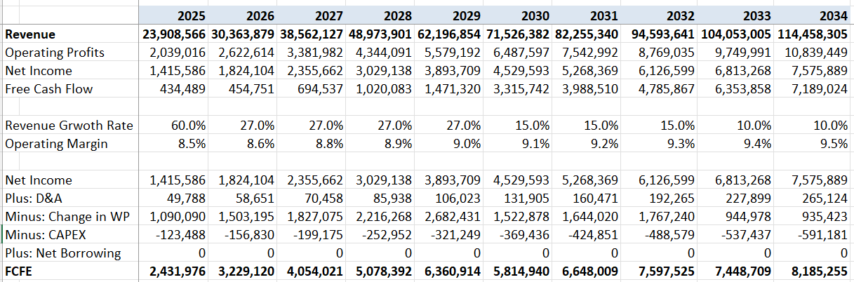 Global Market Insights predicts the global GPU market will grow at a CAGR of 27% from 2024 to 2032. As other AI server manufacturers like Dell Technologies Inc. (DELL) and Hewlett Packard Enterprise Company (HPE) are catching up with the liquid cooling technologies, I anticipate Super Micro Computer’s revenue growth will align with the market growth, increasing 27% from FY26 to FY29, then decelerating to 15% from FY30 to FY32, then further decelerating to 10% from FY33, as their business scales and AI market matures gradually.