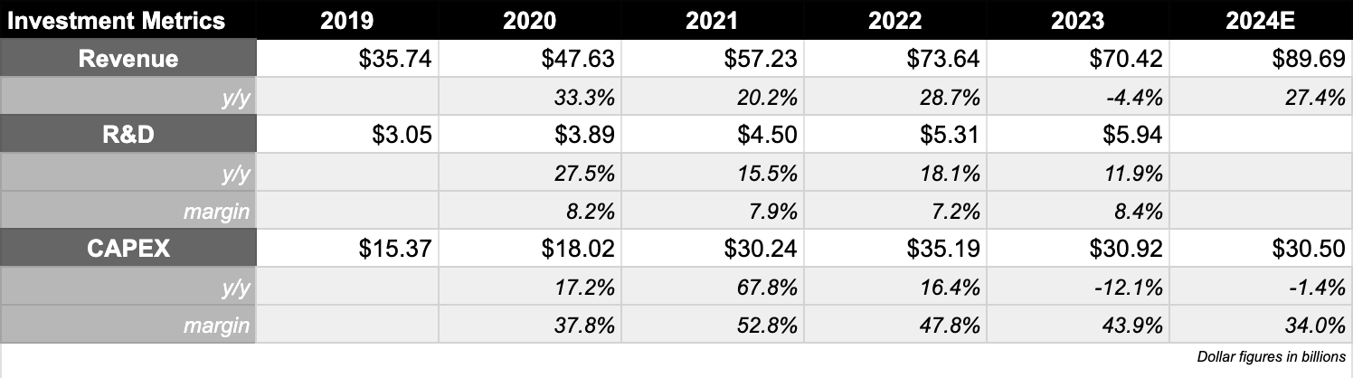 Exhibit E: Taiwan Semiconductor’s R&D and Capex versus Revenue in 2024 in contrast to previous years. (Company filings)
