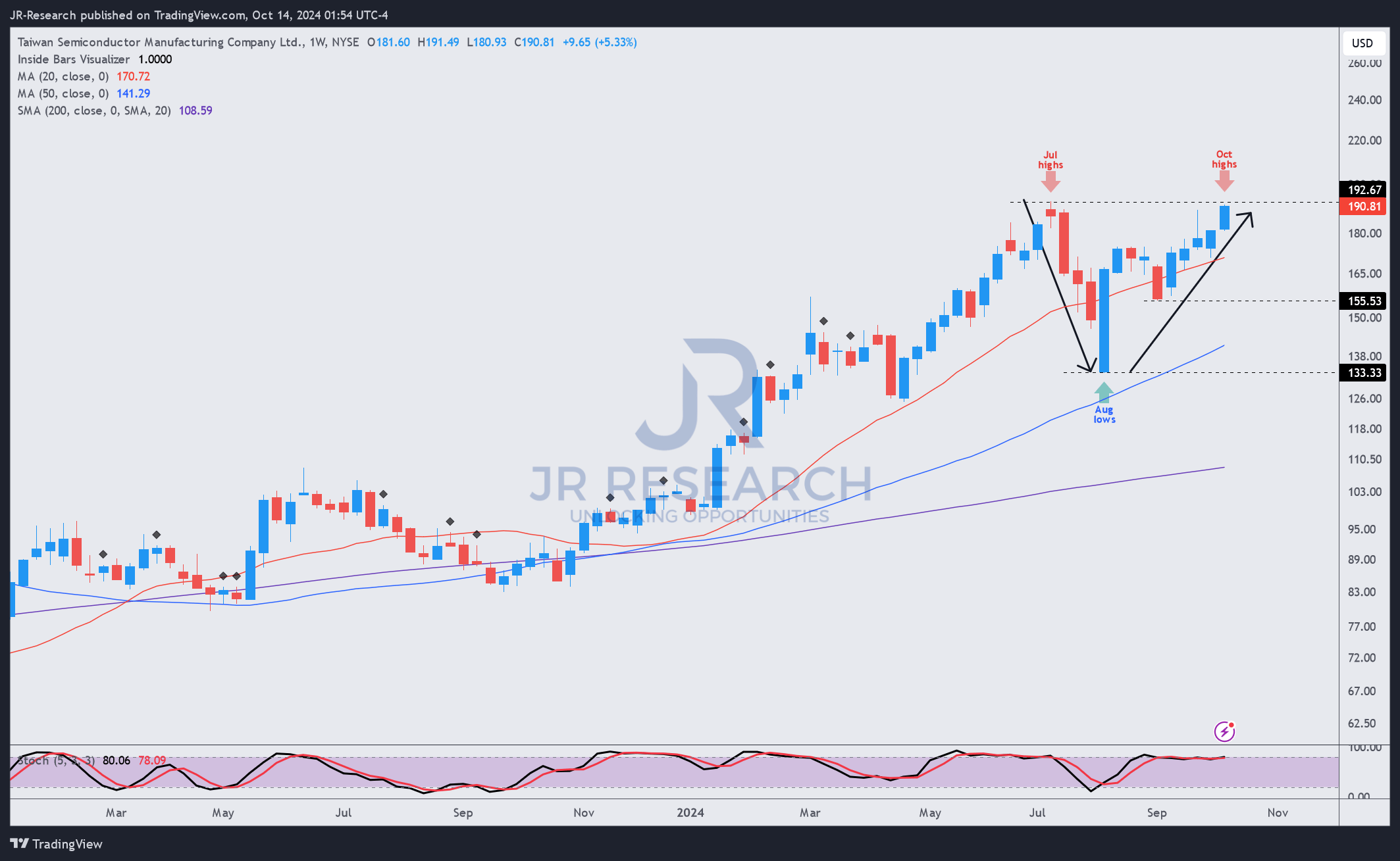 TSM price chart (weekly, medium-term, adjusted for dividends) (TradingView)