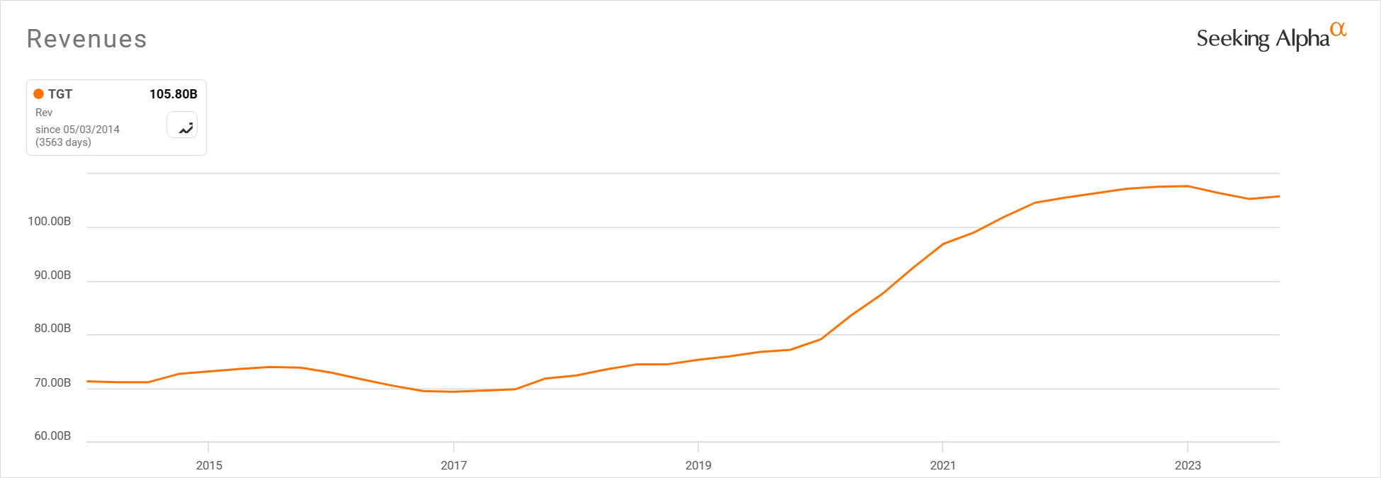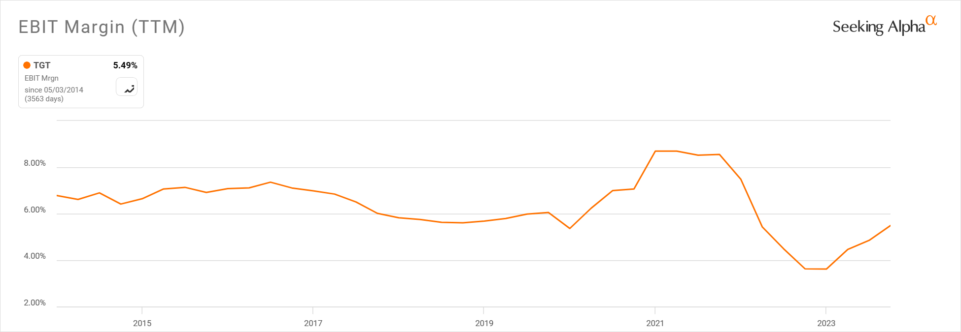 Target Corporation (NYSE:TGT) was a big winner in 2020 and 2021. The store chain did an excellent job adapting to changing customer behavior during the pandemic years, leveraging its stores to fulfill growing online orders by expanding drive-up and same-day delivery options. They also had an advantaged product mix, with more housewares and hard goods desired in the “stay-at-home” economy. This showed up in Target’s financials, with sales increasing 36% over those two years, and operating margins reaching 8% from the 6% that had been typical up to 2019.