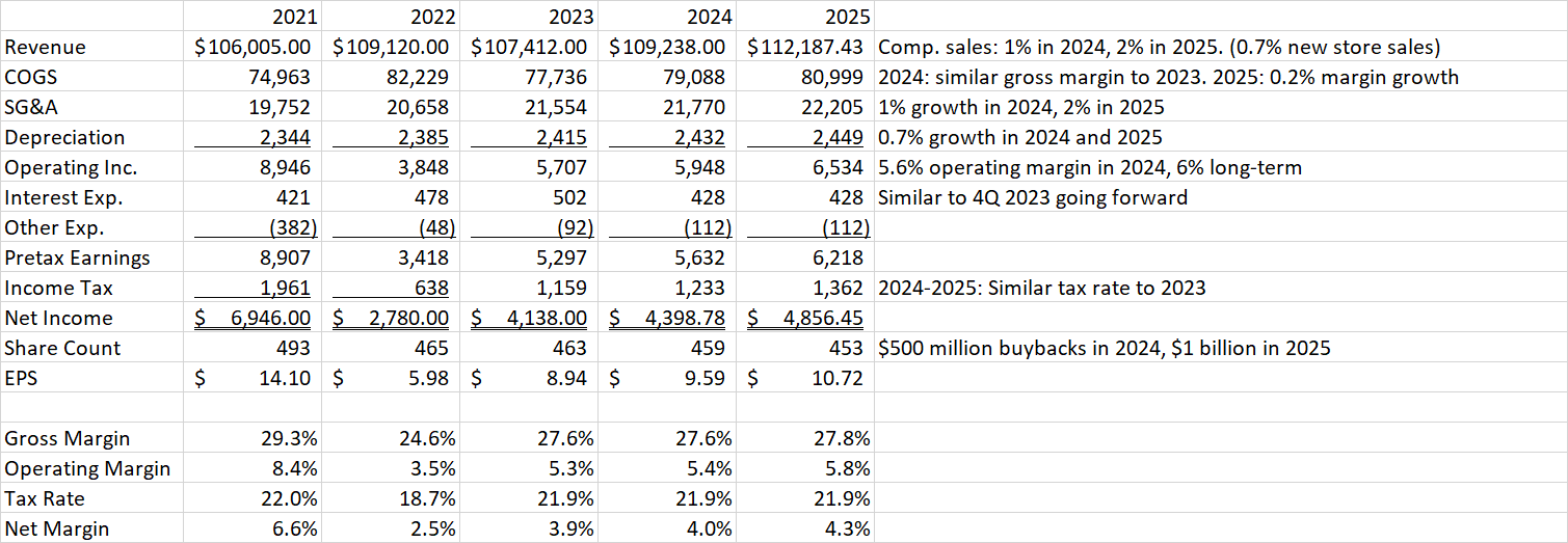 2023 turned out better than I or the company expected one year ago. Although sales declined slightly, operating margin improved to 5.3% for the full-year average, and EPS was $8.94, 49.5% better than 2022 and 15% better than my estimate last March. For 2024, the company is again giving conservative guidance to start the year. As stated in the 4Q earnings release, they are forecasting only 0 to 2% same-store sales growth and EPS of $8.60 to $9.60. It is important to note that 2024 is a 52-week fiscal year, while fiscal 2023 had 53 weeks. Based on my modeling, the top of the range should be easily achievable. I assume 1% same-store sales growth and 0.7% growth from new stores and other revenue like the Roundel ad business. Gross margins are similar to last year. SG&A grows 1% and effective tax rate is similar to last year. This takes operating margin to 5.4%, a slight improvement from 2023 but still below the long-term average goal of 6%.